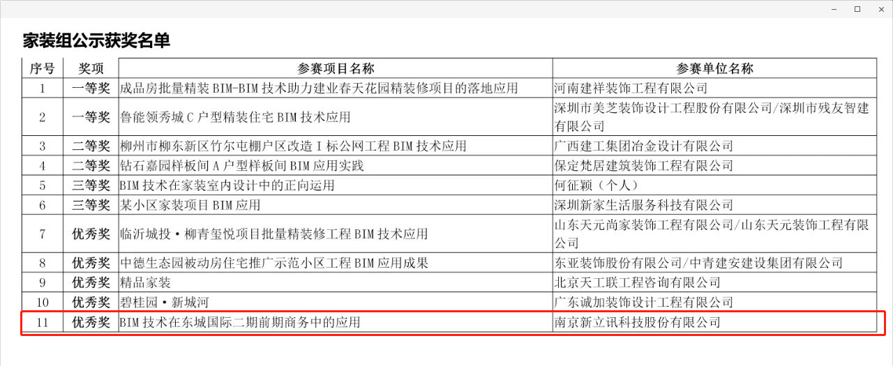 近期,新立訊參報的《BIM技術在某建筑群前期商務中的應用》和《BIM技術在裝飾審計結算中的應用》兩個項目均獲得由中國建筑裝飾協會主辦的《首屆中國建筑裝飾BIM大賽》優秀獎。